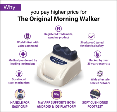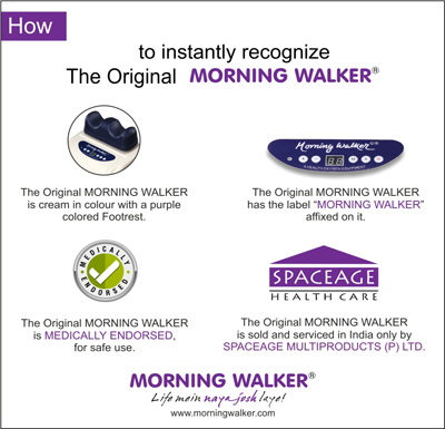 Morning Walker is a scientifically designed, health machine based on the proven principle of goldfish movement. By using it for 15 minutes, you get the benefit of brisk walking 10000 steps. It is compact, portable and simple to use. It is the only one medically tested and endorsed by leading institutions. No wonder it is being used by lacs of families who are drawing great health benefits from it. MORNING WALKER can be used anytime, any place by people of all ages starting from a 8 year old kid without any side effect. It is portable, compact and easy to operate. It consumes just 50 watts of power.